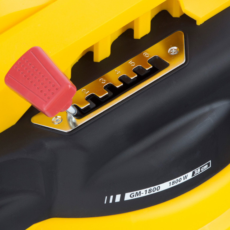 Высота подреза травы регулируется с помощью рычага, расположенного на корпусе.